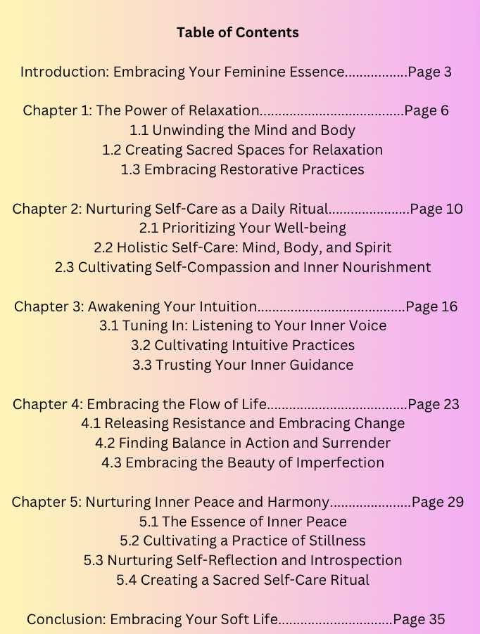Nurturing self-care will be a cornerstone of this journey. We will explore the importance of prioritizing your well-being and creating a personal self-care routine that nourishes your body, mind, and spirit. Through practical practices, you will learn how to cultivate a deeper sense of self-love and compassion.🌸 Discover your inner sparkle! 🌟 Explore feminine energy & its harmony with masculine. Unlock self-understanding & world interactions. Let's embark on this epic journey! ✨